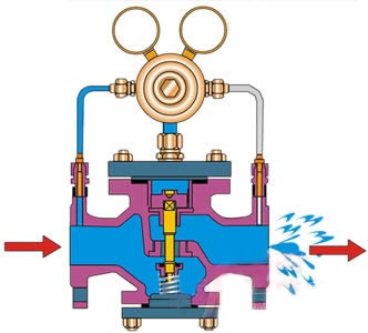 YK43F气体减压阀通过调节调节弹簧压力设定出口压力、利用膜片传感出口压力变化,通过导阀启闭驱动活塞调节主阀节流部位过流面积的大小,实现减压稳压功能。