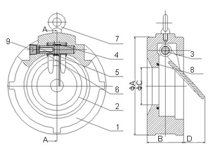 • H74W对夹式单瓣止回阀 主要外形尺寸及连接尺寸